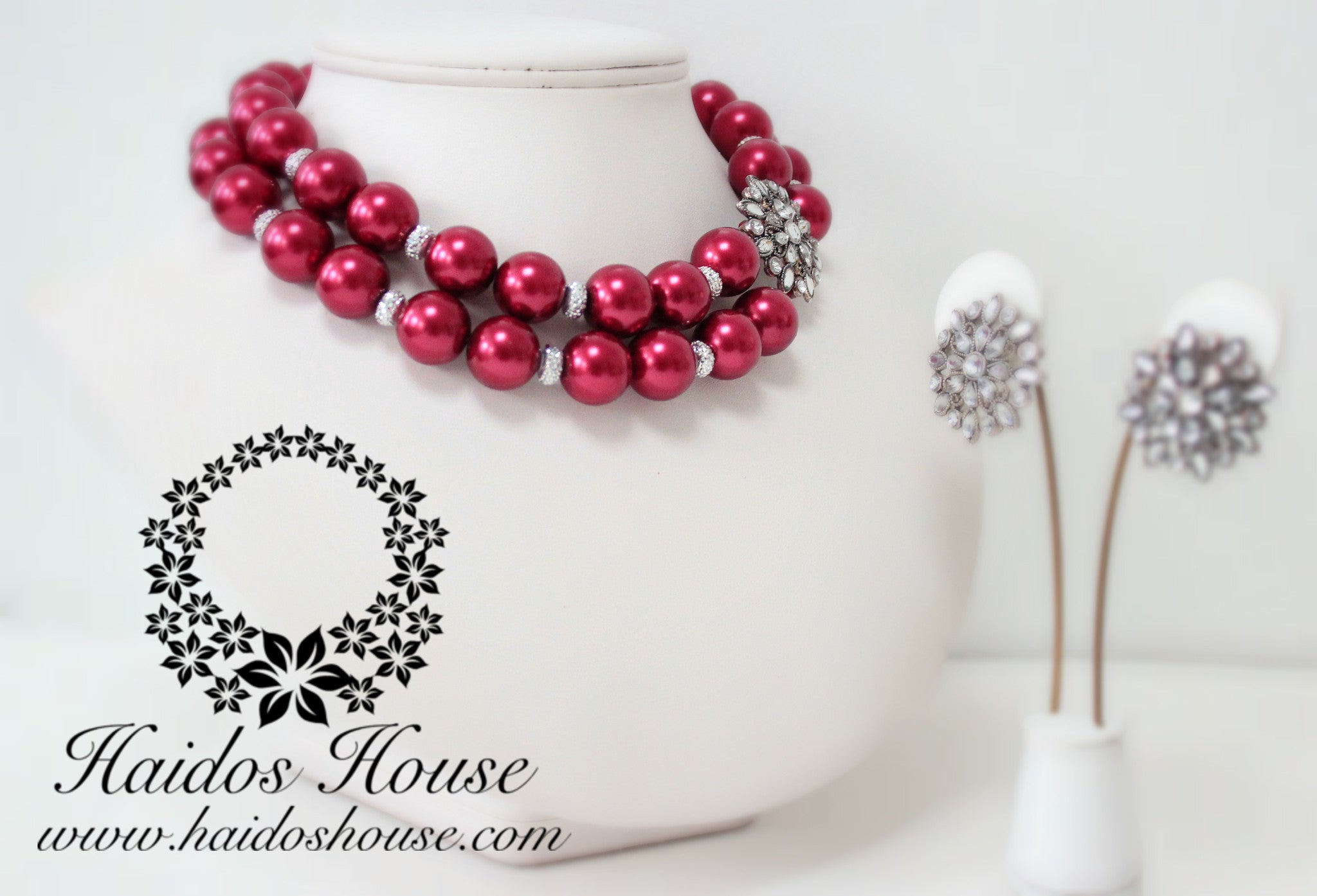 Yes!!! Elegantly Simple!!! Chic and Classy!!! This combination of Large Wine Pearlized Beads and Silver is perfect! This design is just right for this season and is a definite MUST-HAVE for the queen that you are! Set includes matching earrings and bracelet. Set is also available in more layers if desired. This lovely set can be made in just about any color combination wanted! It's become one of our best-sellers, here at Haidos House!!!