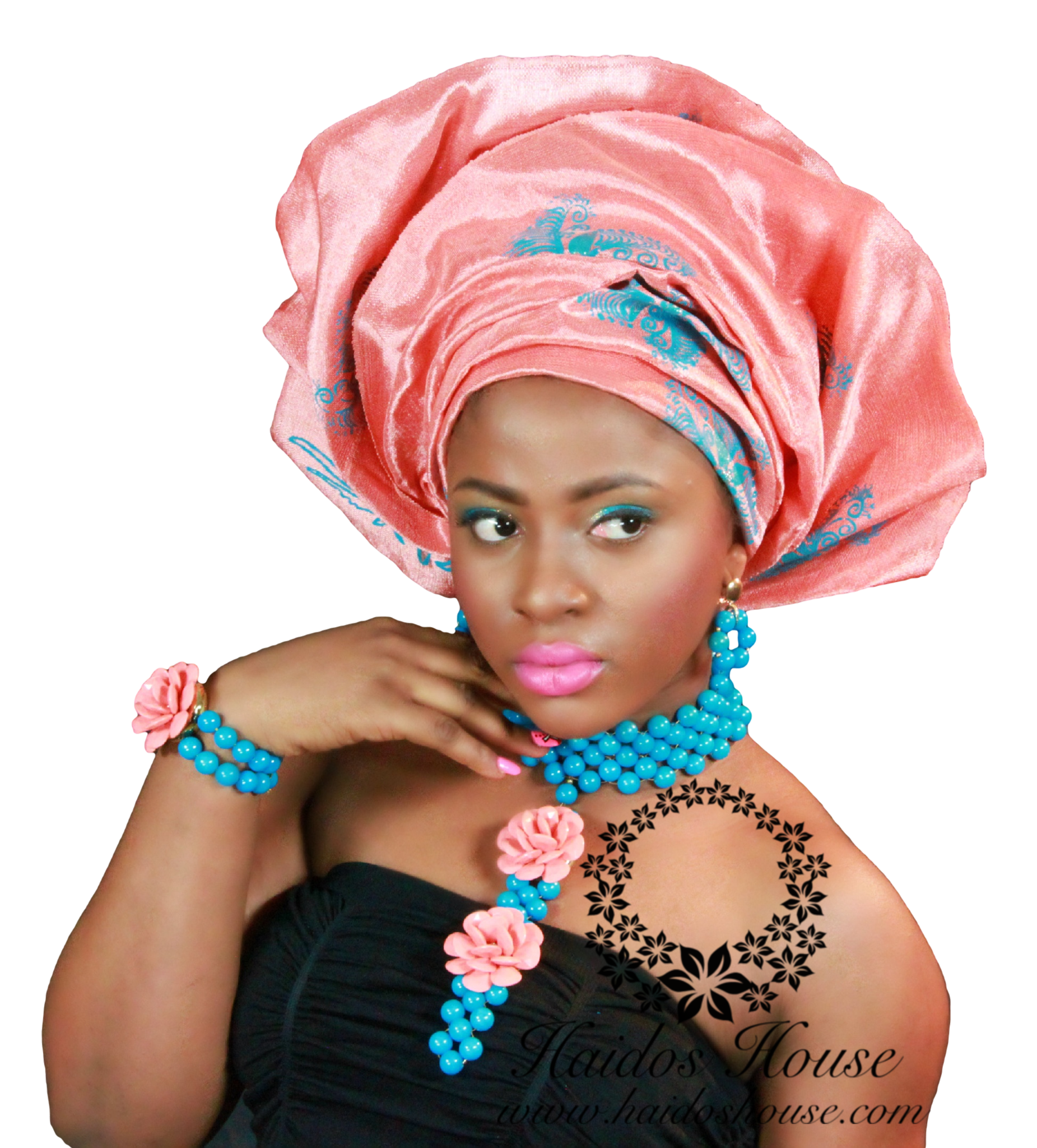 Gorgeous Turquoise Jade Beads accented with Peach flowers to create this regal design. This "Fit-For-A-Queen" set comes with matching earrings and bracelet. Length of the drop pendant can be adjusted to your preference, just give us a call to speak with one of our client specialists for assistance. This design can be made in most color combinations. Need to order more than 1? We've got you covered! Call us today at 855.424.3671 or send an email to info@haidoshouse.com.