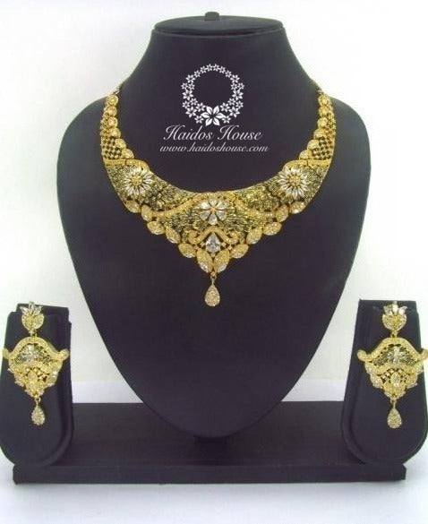 Beautiful 18k-22k tarnish resistant jewelry sets. These designs are unique and exquisite enough for any event! Set comes with Necklace and earrings. Need more than 1 set? Give us a call at 855.424.3671 or send us an email: info@haidoshouse.com You can also find us on IG @HaidosHouse and Like our facebook page: Haidos House
