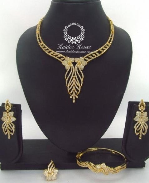 Beautiful 18k-22k tarnish resistant jewelry sets. These designs are unique and exquisite enough for any event! Set comes with Necklace, earrings, bracelet and ring. Need more than 1 set? Give us a call at 855.424.3671 or send us an email: info@haidoshouse.com You can also find us on IG @HaidosHouse and Like our facebook page: Haidos House