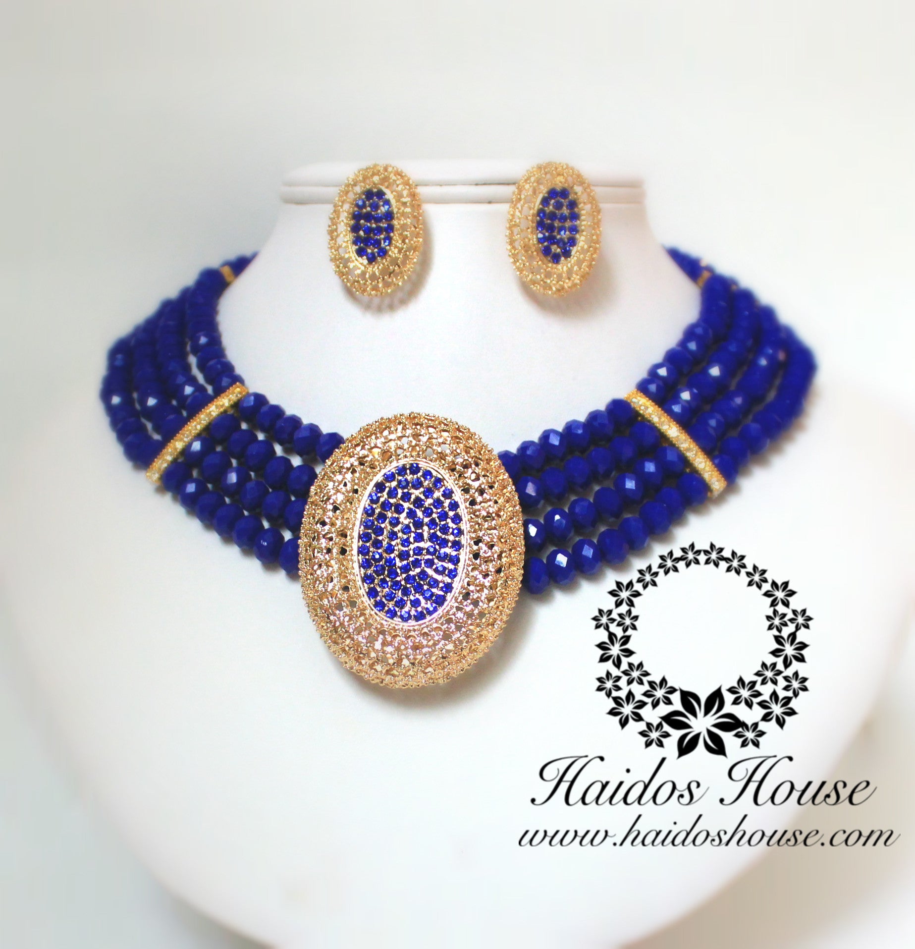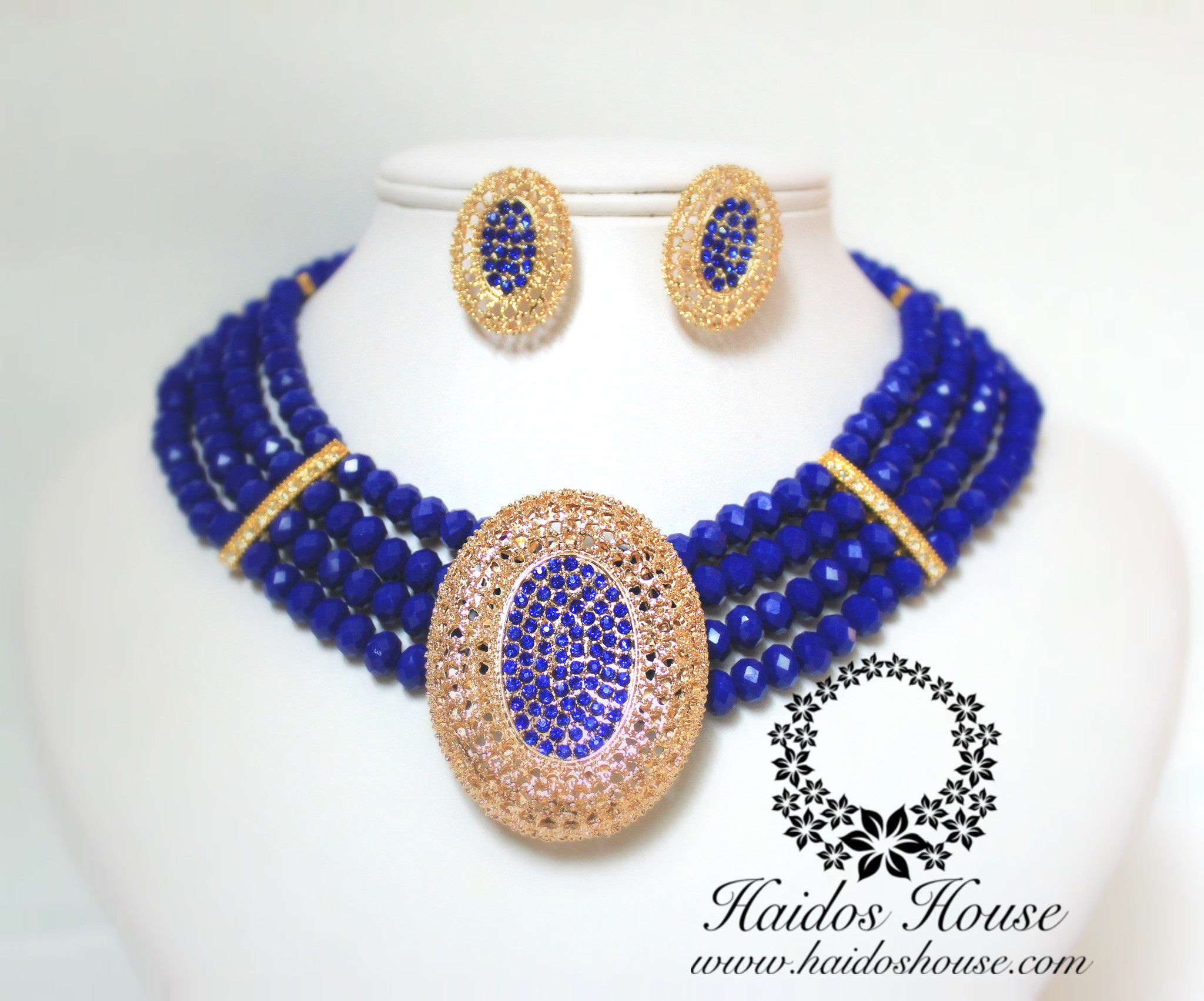 Lovely Royal Blue Faceted Glass Beads and Pendant Set with matching earrings and bracelet. A "MUST HAVE" for every fashionista and makes for a perfect gift!!! This design can be made in any color of choice. Need another color or more than 1 set (aso-ebi)? Need more information? Call our dedicated client specialists today at 855.424.3671 or send an email to: info@haidoshouse.com.