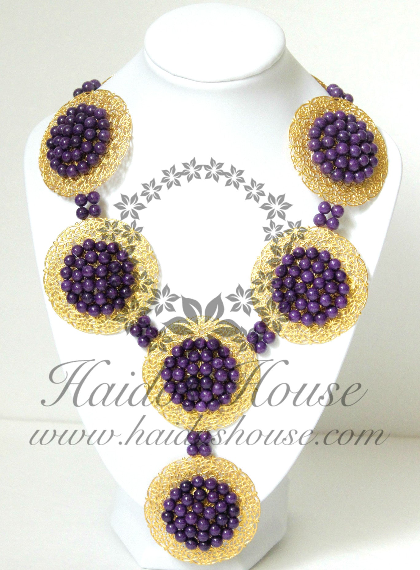 Chic and cute, this design is one of our fun designs here at Haidos House! This purple bead set on yellow gold comes with matching earrings and bracelet. Available in ALL colors!!! Perfect for weddings, engagements and other events. Set can be made in more layers, depending on clients choice. Beads set ship out 5 days after placing order. Need it sooner? Need more than 1 set (aso-ebi)? Need more information? Call our dedicated client specialists today at 855.424.3671 or send an email to: info@haidoshouse.com.