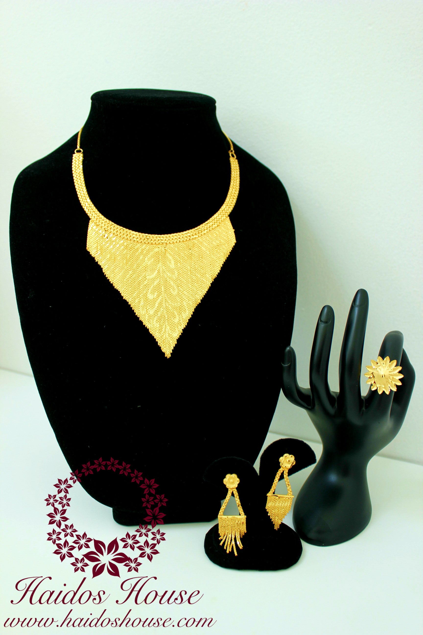 Beautiful 18k-22k tarnish resistant jewelry sets. These designs are unique and exquisite enough for any event! Set comes with Necklace, earrings and ring. Need more than 1 set? Give us a call at 855.424.3671 or send us an email: info@haidoshouse.com You can also find us on IG @HaidosHouse and Like our facebook page: Haidos House