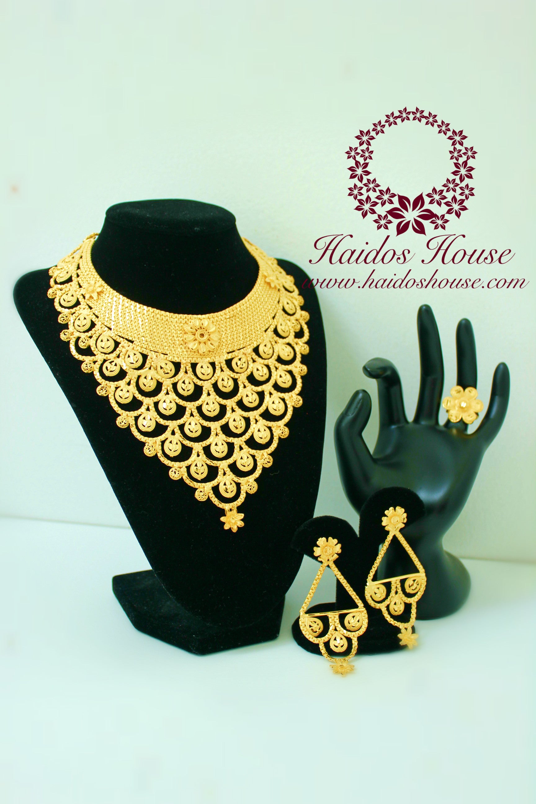 Beautiful 18k-22k tarnish resistant jewelry sets. These designs are unique and exquisite enough for any event! Set comes with Necklace, earrings and ring. Need more than 1 set? Give us a call at 855.424.3671 or send us an email: info@haidoshouse.com You can also find us on IG @HaidosHouse and Like our facebook page: Haidos House
